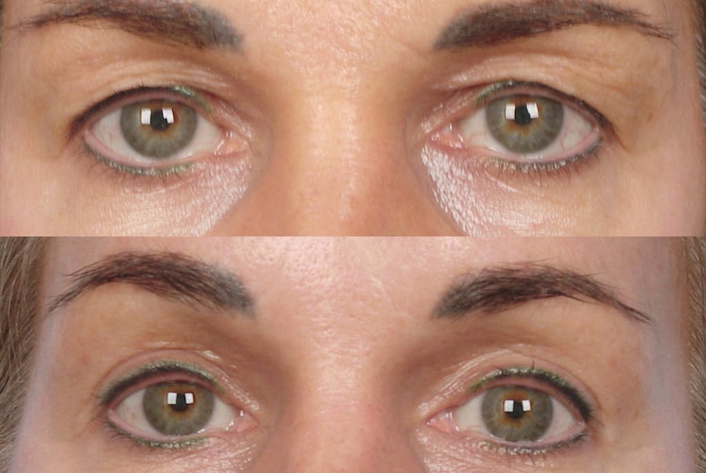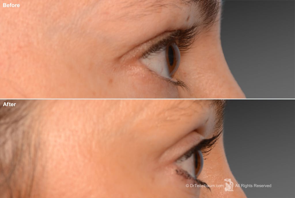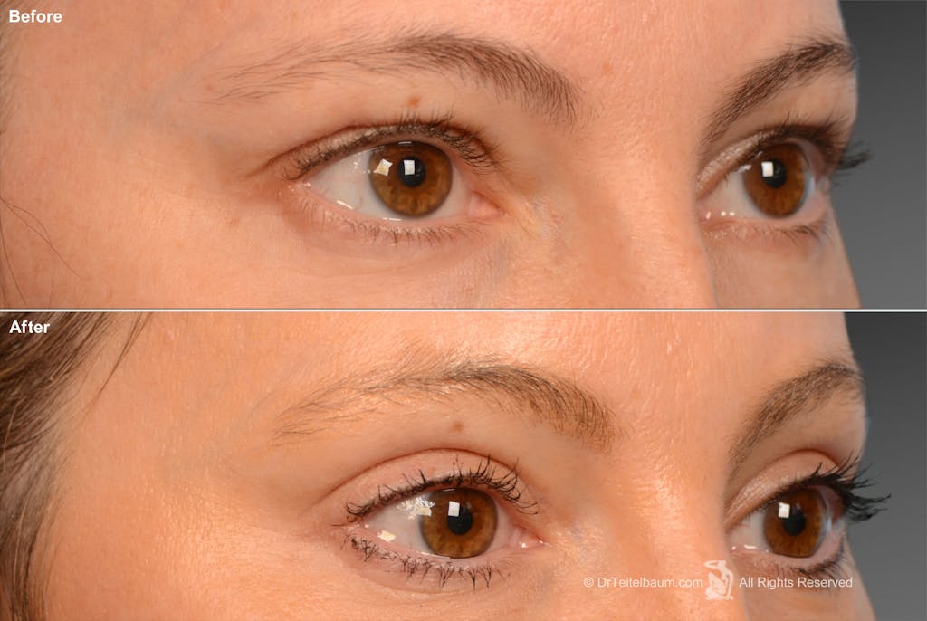 When mild skin laxity is present, a very conservative skin pinch may be added. Dr. Teitelbaum is careful to maintain fullness and support of the lower lid, avoiding the hollowed or pulled-down appearance that can occur when too much skin or fat is removed.